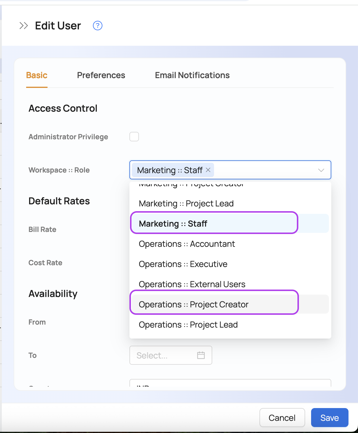 You can assign roles to users in workspaces if you have administrative privileges. To assign roles, open the add/edit user form and select all the workspace::role combinations. In the following example, Janet is playing the role Developer in the Engr workspace. - All - :: <Role> is a shortcut to specify the same role in all workspaces. In this case, the CEO will most likely be assigned the role - All :: Executive. You can read more about this topic in this chapter.